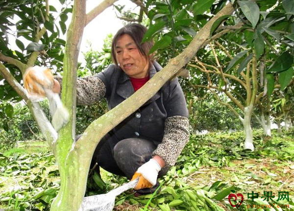 剪除病虫枝叶,疏除介壳虫、枝天牛、溃疡病和煤烟病的病叶、枯枝和残果;除净果园周围杂草并把病虫枝一同带出园外烧毁。修剪伤口及时涂抹油脂,封闭伤口,保护伤口愈合。