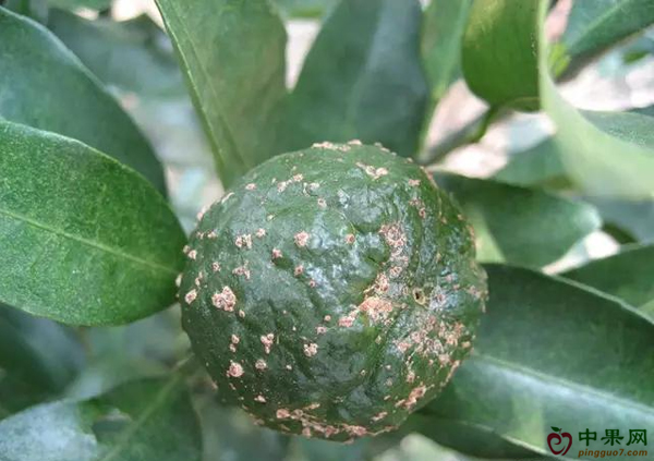 幼果初受害时也是上述症状,受害严重时,病斑常聚集成片,使果小畸形,引起幼果早期脱落。受害较迟的果实,多数发育不良,常表现为果实表面粗糙、皮厚、果小、汁少、味酸或成为畸形果。