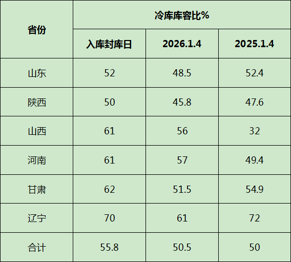 2025/2026苹果主要库存区样本冷库库容消耗进度统计(2026.1.4)翻译搜索复制…[