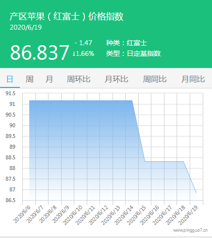 本日产区苹果指数:86.837,较昨日下降1.47,降幅1.66%。