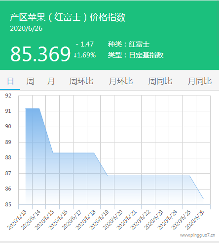 本日产区苹果指数:85.369,较昨日下降1.47,降幅1.69%。