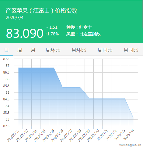 本日产区苹果指数:83.090,较昨日下降1.51,降幅1.78%。