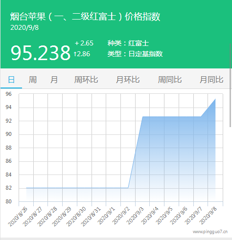 本日烟台苹果指数:95.238,较昨日上涨2.65,涨幅2.86%。