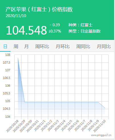 本日产区苹果指数:104.548,较昨日下降0.39,降幅0.37%。