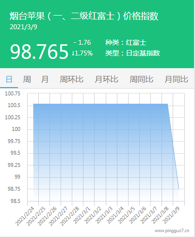 本日烟台苹果指数:98.765,较昨日下降1.76,降幅1.75%。