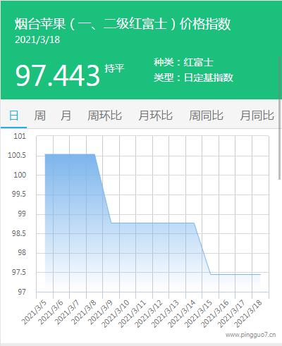 本日烟台苹果指数:97.443,较昨日持平。