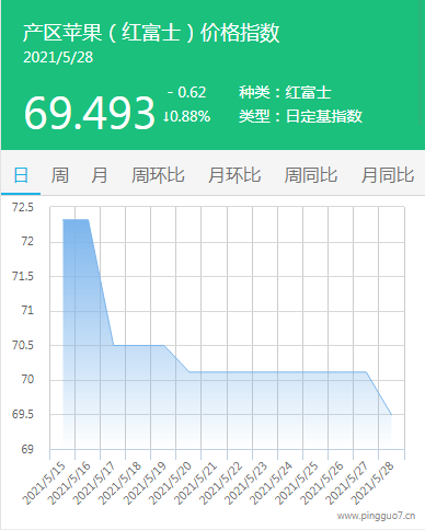 本日产区苹果指数:69.493,较昨日下降0.62,降幅0.88%。