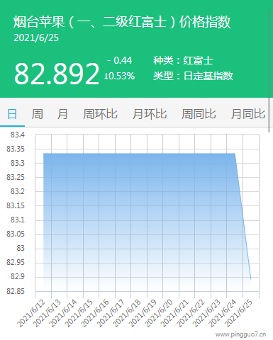 本日烟台苹果指数:82.892,较昨日下降0.44,降幅0.53%。