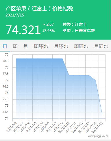 本日产区苹果指数:74.321,较昨日下降2.67,降幅3.46%。