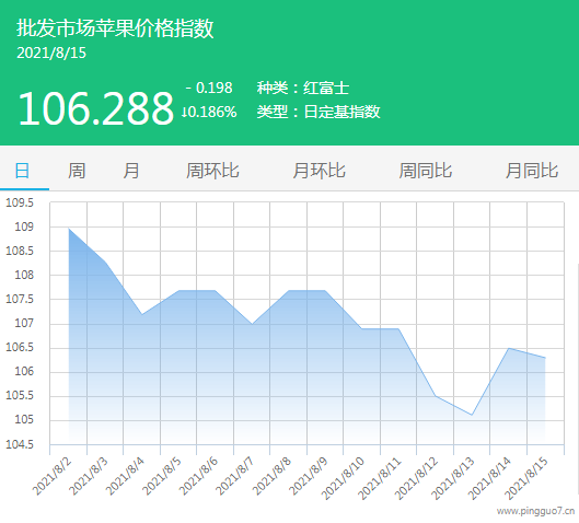 本日批发市场苹果指数106.288,较昨日下降0.198,跌幅0.186%。