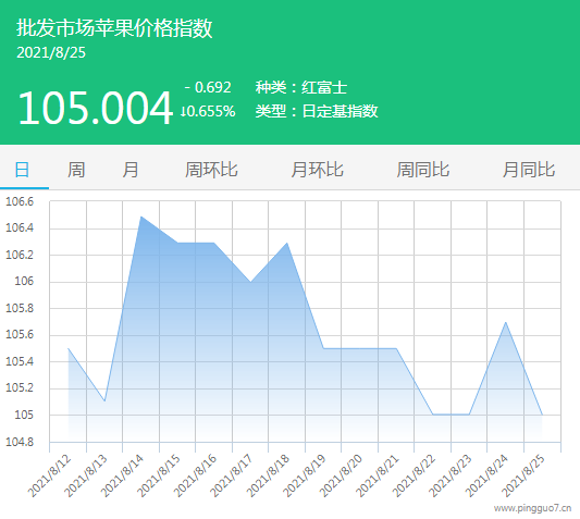 今日批发市场苹果指数105.004,较昨日下降0.692,跌幅0.655%。