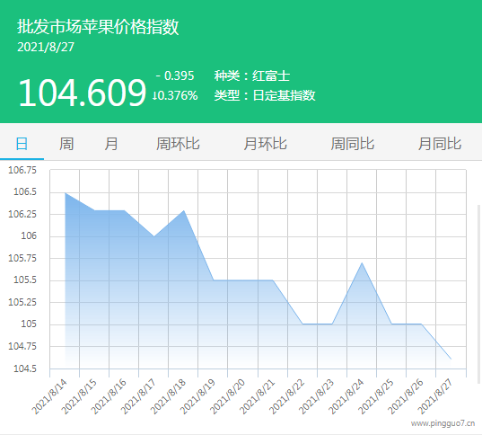 今日批发市场苹果指数104.609,较昨日下跌0.395,跌幅0.376%。
