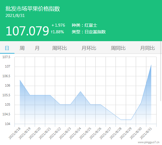 今日批发市场苹果指数107.079,较昨日上涨1.976,涨幅1.88%。