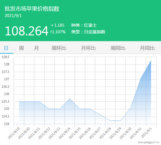今日批发市场苹果指数108.264,较昨日上涨1.185,涨幅1.107%。