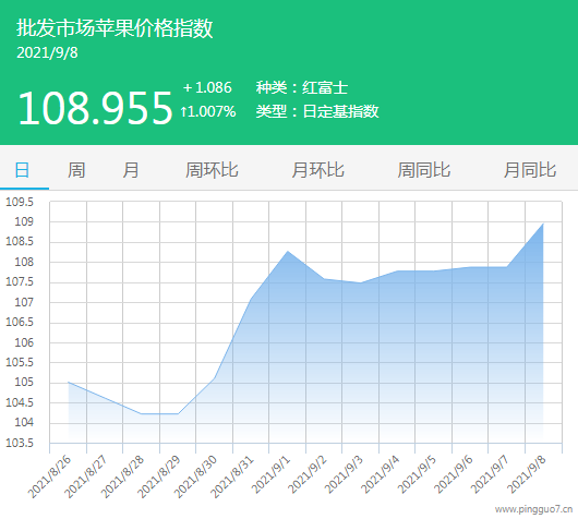 今日批发市场苹果指数108.955,较昨日上涨1.086,涨幅1.007%。