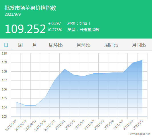 今日批发市场苹果指数109.252,较昨日上涨0.297,涨幅0.273%。