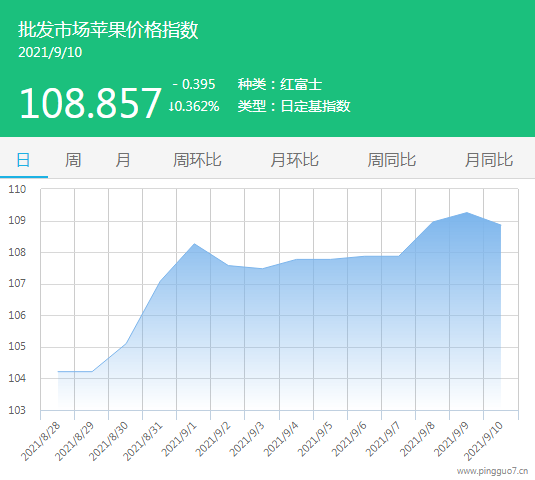 今日批发市场苹果指数108.857,较昨日下降0.395,跌幅0.362%。