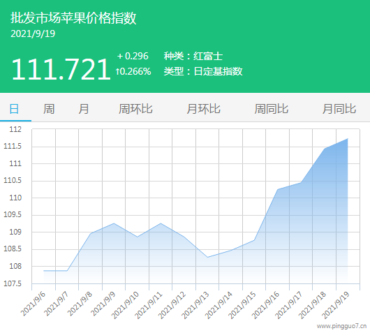 今日批发市场苹果指数111.721,较昨日上涨0.296,涨幅0.266%。