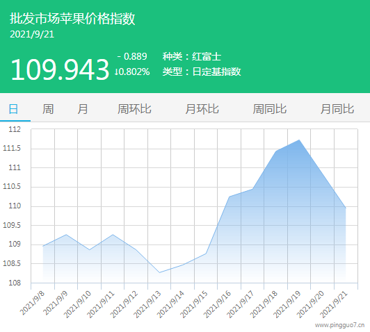 今日批发市场苹果指数109.943,较昨日下降0.889,跌幅0.802%。