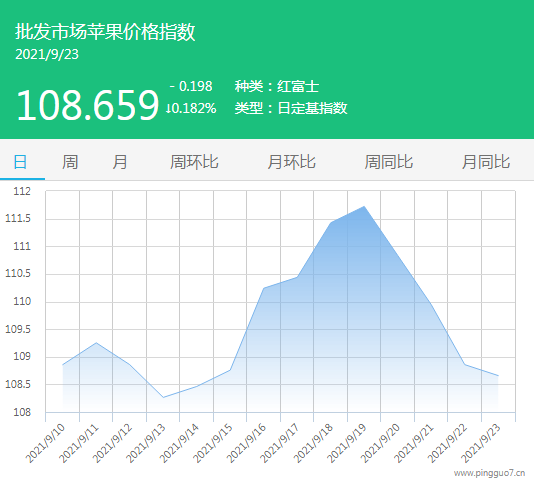 今日批发市场苹果指数108.659,较昨日下降0.198,跌幅0.182%。