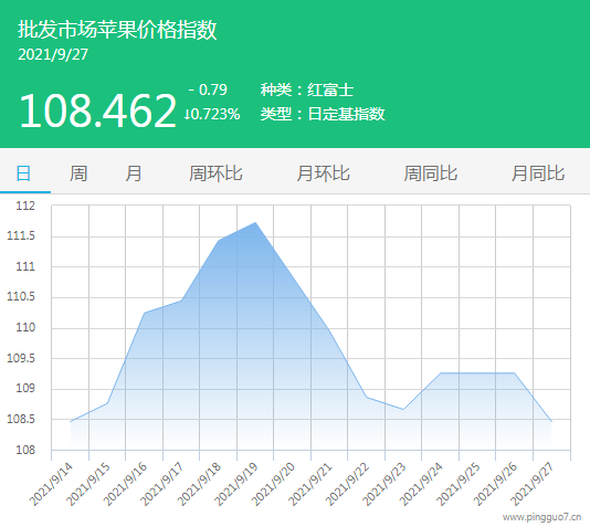 今日批发市场苹果指数108.462,较昨日下跌0.79,跌幅0.723%。