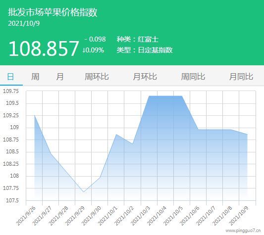 今日批发市场苹果指数108.857,较昨日下降0.098,跌幅0.09%。