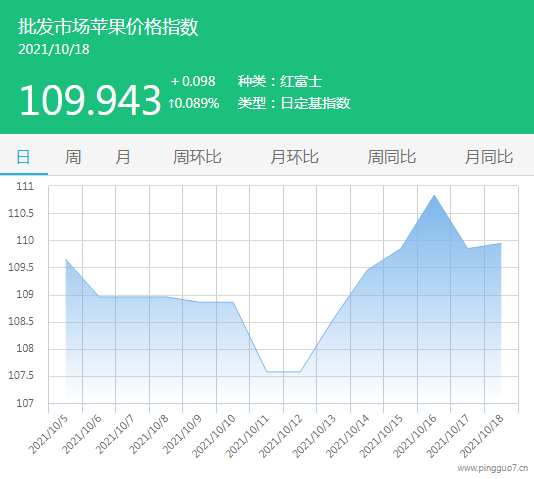 今日批发市场苹果指数109.943,较昨日上涨0.098,涨幅0.089%。