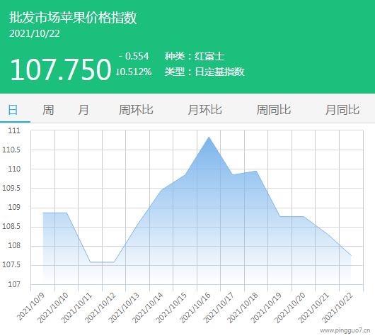 今日批发市场苹果指数107.750,较昨日下跌0.554,跌幅0.512%。