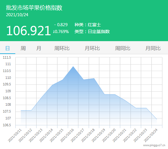 今日批发市场苹果指数106.921,较昨日下跌0.829,跌幅0.769%。