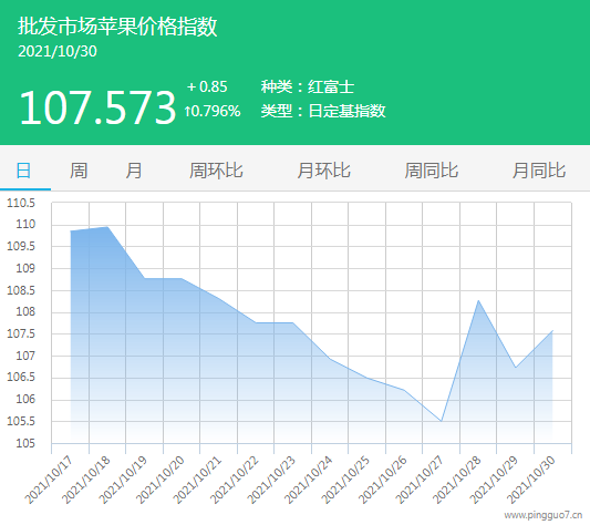 今日批发市场苹果指数107.573,较昨日上涨0.85,涨幅0.796%。