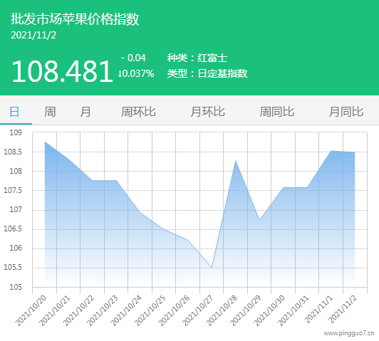 今日批发市场苹果指数108.481,较昨日下跌0.04,跌幅0.037%。