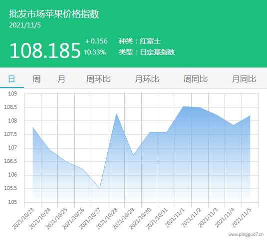 今日批发市场苹果指数108.185,较昨日上涨0.356,涨幅0.33%。