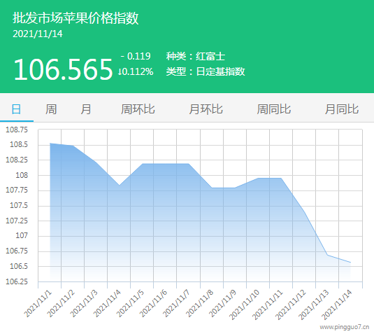 今日批发市场苹果指数106.565,较昨日下跌0.119,跌幅0.112%。