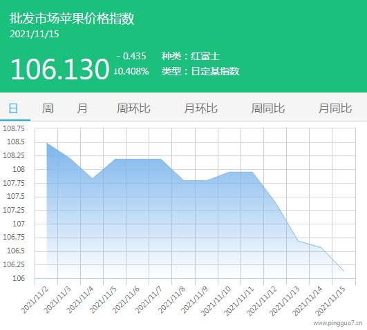 今日批发市场苹果指数106.130,较昨日下跌0.435,跌幅0.408%。