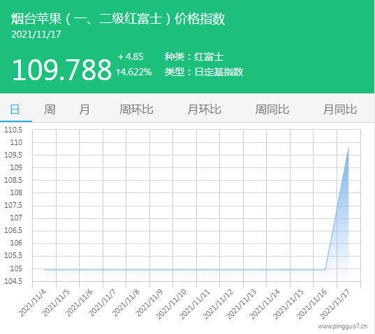 今日烟台苹果指数:109.788,较昨日上涨4.85,涨幅4.622%。