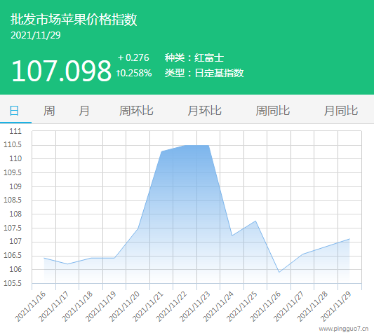 今日批发市场苹果指数107.098,较昨日上涨0.276,涨幅0.258%。