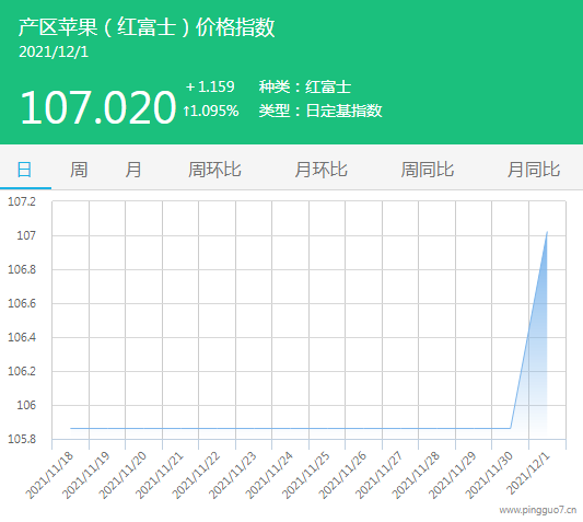 今日产区苹果指数:107.020,较昨日上涨1.159,涨幅1.095%。