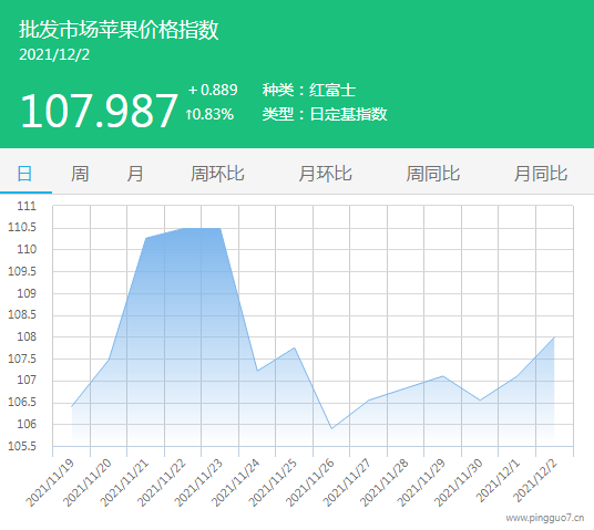今日批发市场苹果指数107.987,较昨日上涨0.889,涨幅0.83%。